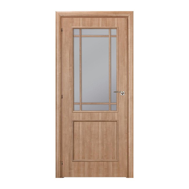 Дверное полотно двери межкомнатной Brama Такт 8.6 включает секцию со стеклом.