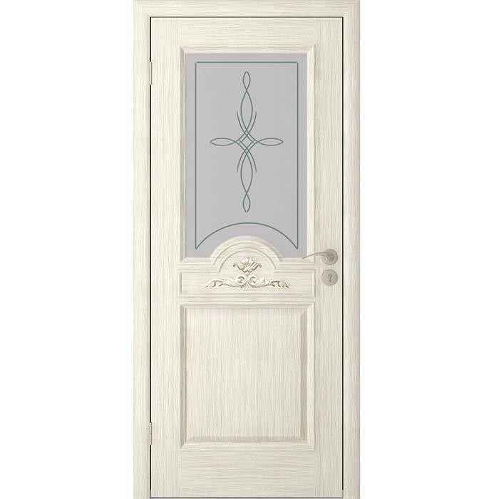 Стекло – мателюкс белого цвета с художественной фрезеровкой. Стекло имеет матовое покрытие с лицевой стороны двери и глянцевое с оборотной.