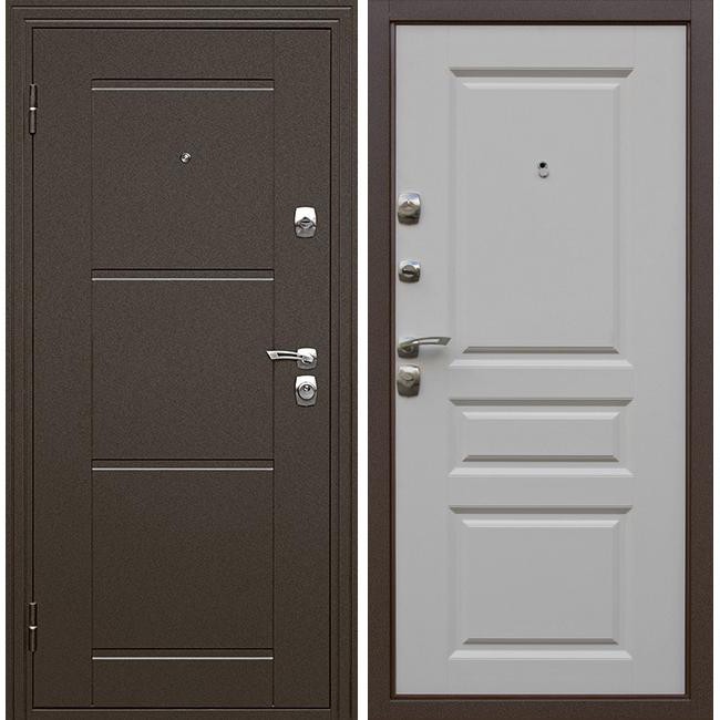 Дизайн и роскошный белый цвет внутренней фрезерованной панели из МДФ отлично сочетаются с различными интерьерными решениями современных тенденции дизайна большинства межкомнатных дверей и легко впишутся в любые интерьеры. Наружная отделка — металл, антивандальное, атмосферостойкое полимерно-порошковое напыление с выштамповкой. Никелированная фурнитура выгодно смотрится на глубоком коричневом цвете полотна, а также и на текстуре дерева.