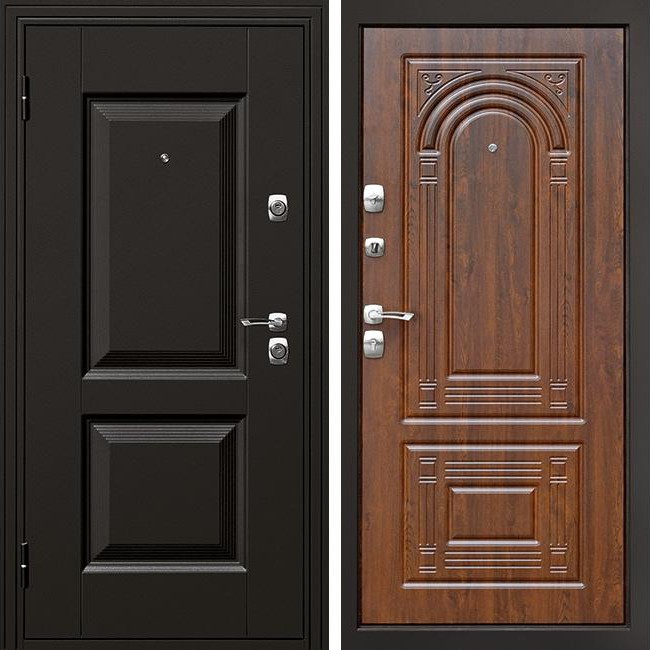 Дизайн и цвет внутренней панели отлично сочетаются с различными интерьерными решениями. Они повторяют современные тенденции дизайна большинства межкомнатных дверей и легко впишутся в любые интерьеры. В данной модели - это панель МДФ с фрезерованным рисунком в популярном цвете Орех. С внешней стороны дверь имеет антивандальное покрытие цвета черный графит и классическое оформление. Никилерованная фурнитура выгодно смотрится на насыщенном черном цвете полотна, а также и на текстуре дерева.