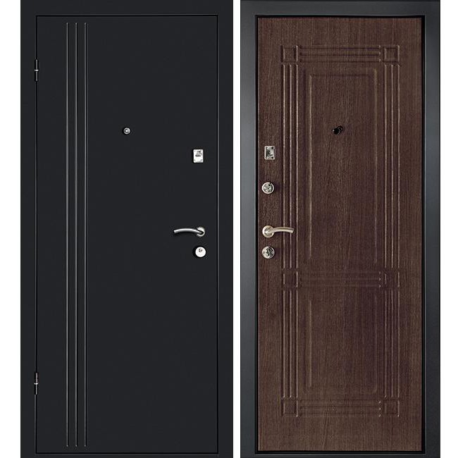 Дизайн и цвет внутренней панели отлично сочетаются с различными интерьерными решениями. Они повторяют современные тенденции дизайна большинства межкомнатных дверей и легко впишутся в любые интерьеры. В данной модели - это панель МДФ с фрезерованным геометрическим орнаментом в благородном цвете Венге. С внешней стороны дверь имеет антивандальное покрытие цвета графит и лаконичное оформление вертикальными полосами. Хромированная фурнитура выгодно смотрится на насыщенном черном цвете полотна, а также и на текстуре дерева.