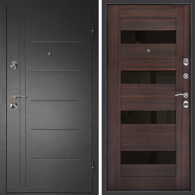 Модель серии Сити-С выделяется оригинальным дизайном в стиле «модерн». Лаконичное оформление внешней стороны и интересная отделка внутренней панели декоративными глянцевыми вставками "Лакобель". Дверь обладает достойными техническими характеристиками. Рекомендуется для установки как на улицу, так и внутри помещений. Хромированная фурнитура выгодно смотрится на глубоком сером цвете полотна, а также и на темной текстуре дерева.