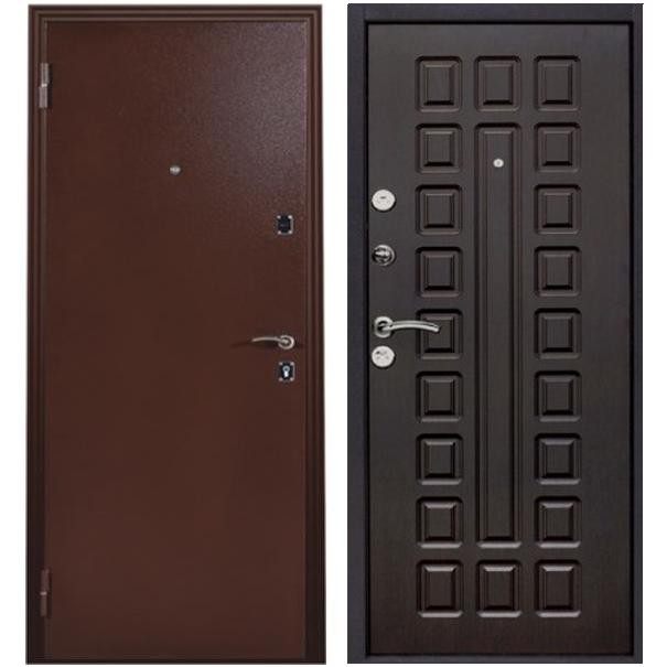 Каркас дверного полотна укреплен системой горизонтальных ребер жесткости. Два противовзломных внутренних штыря установленные на дверном полотне с петлевой стороны, надежно фиксируют его в дверной коробке, обеспечивая защиту при попытке взлома путем срезания петель.