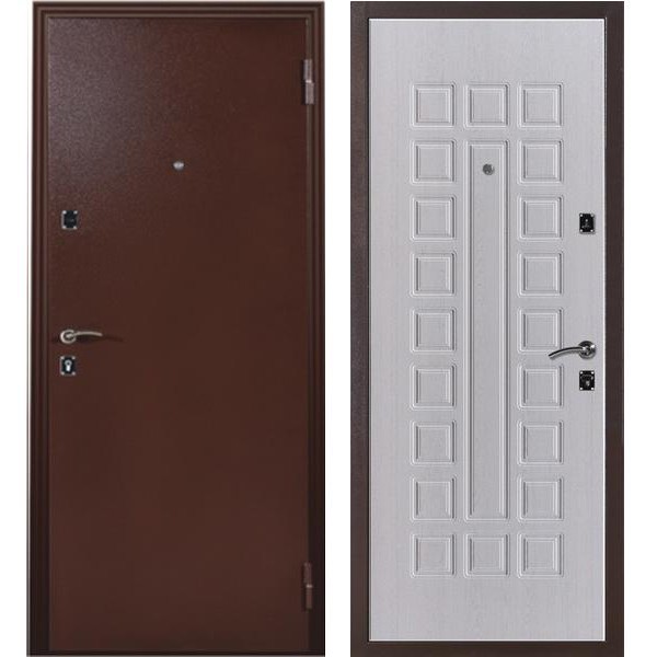 Каркас дверного полотна укреплен системой горизонтальных ребер жесткости. Два противовзломных внутренних штыря установленные на дверном полотне с петлевой стороны, надежно фиксируют его в дверной коробке, обеспечивая защиту при попытке взлома путем срезания петель.