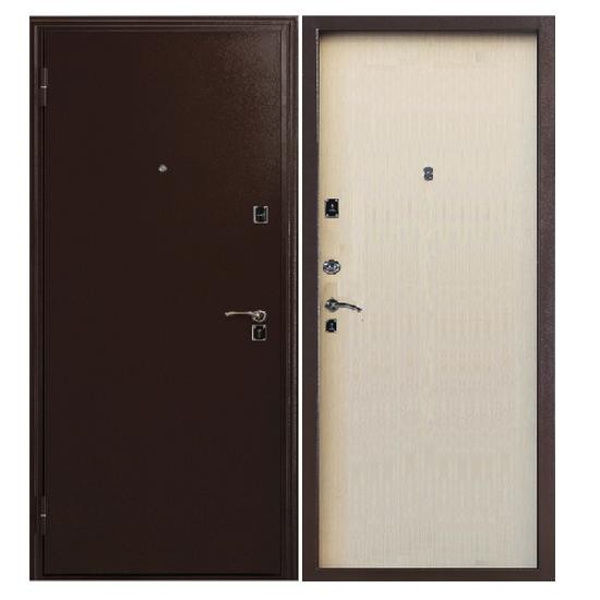 Входная металлическая дверь Меги 180 изготовлена из холоднокатаного стального листа. Внешняя сторона двери - цвет медь (порошковое покрытие), внутренняя сторона - цвет беленый дуб, панель гладкая из ламинированной МДФ. Утеплитель - пенополистерол.