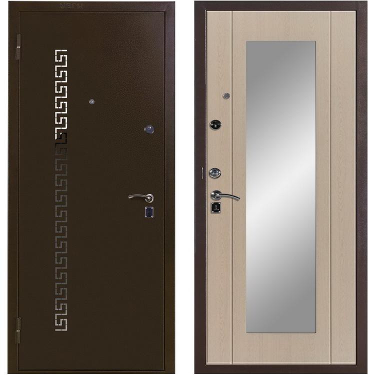 Входная металлическая дверь Меги 368 изготовлена из холоднокатаного стального листа. Внешняя сторона - металлическая с фигурным рисунком и декоративными вставками из зеркала, внутренняя - из фрезерованного МДФ 8 мм, ламинированный пленкой ПВХ / ПВХ Винорит.