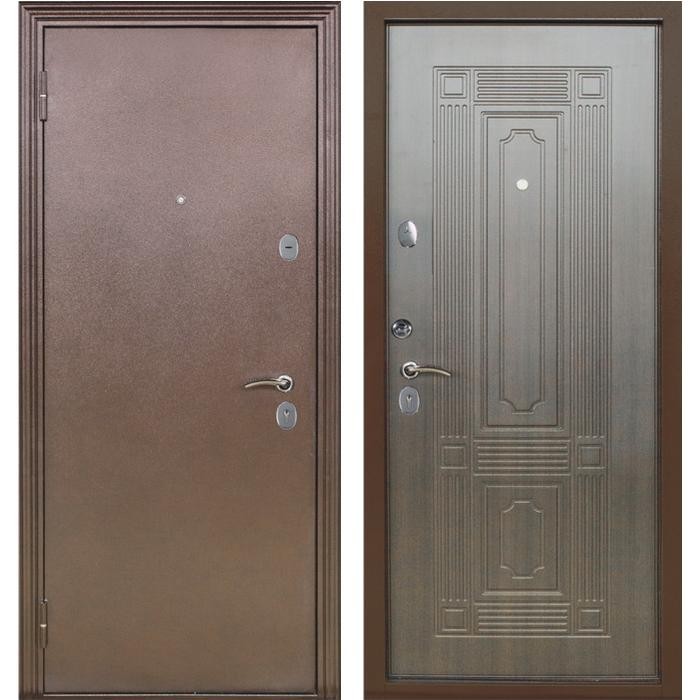 Входная металлическая дверь Меги 541 изготовлена из холоднокатаного стального листа. Внешняя сторона двери - порошковое покрытие Медный антик, внутренняя сторона - МДФ толщиной 8 мм с фрезеровкой, ламинированный пленкой ПВХ цвета Венге.