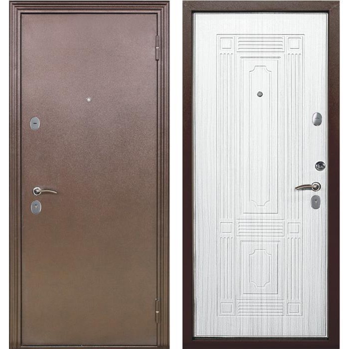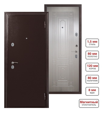 Входная металлическая дверь Меги 541 изготовлена из холоднокатаного стального листа. Внешняя сторона двери - порошковое покрытие Медный антик, внутренняя сторона - МДФ толщиной 8 мм с фрезеровкой, ламинированный пленкой ПВХ цвета Беленый дуб.