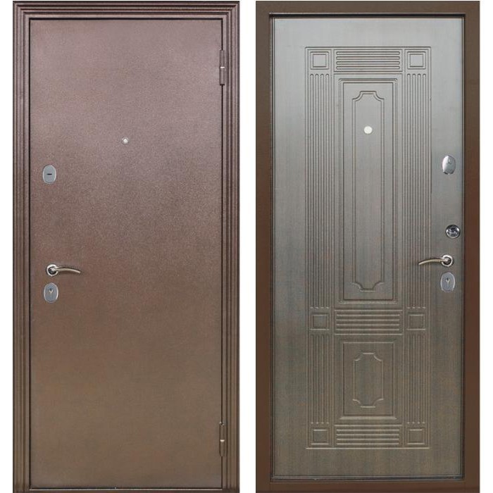 Входная металлическая дверь Меги 541 изготовлена из холоднокатаного стального листа. Внешняя сторона двери - порошковое покрытие Медный антик, внутренняя сторона - МДФ толщиной 8 мм с фрезеровкой, ламинированный пленкой ПВХ цвета Венге.