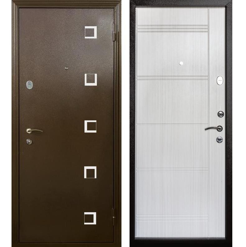 Входная металлическая дверь Меги 553 (модель 553-0546) серии Стандарт изготовлена из холоднокатаного стального листа. Внешняя сторона двери - порошковое покрытие цвета Медный антик, внутренняя сторона - МДФ толщиной 12 мм с фрезеровкой, ламинированный пленкой ПВХ цвета Беленый дуб. Особую изюминку двери придаёт наружные вставки из металла.
