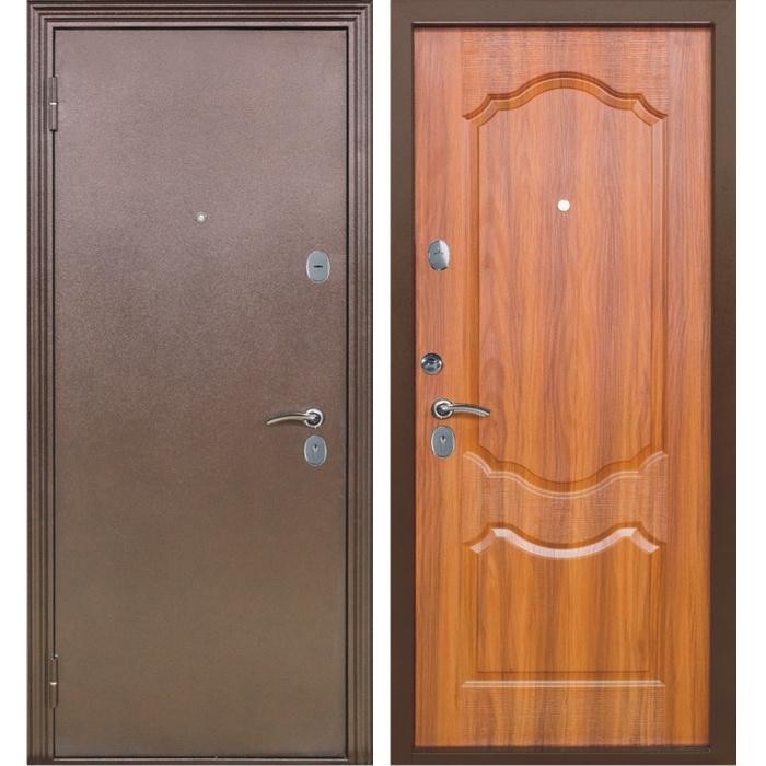 Входная металлическая дверь Меги 592 изготовлена из холоднокатаного стального листа. Внешняя сторона двери - порошковое покрытие медный антик, внутренняя сторона - формованная МДФ толщиной 3 мм с фрезеровкой 1022 и с ПВХ пленкой (скин) цвета Итальянский орех.