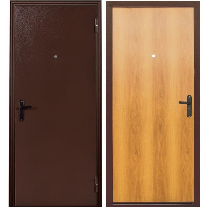 Входная металлическая дверь Меги 60 серии Эконом изготовлена из холоднокатаного стального листа. Внешняя сторона двери - порошковое покрытие антик медь, внутренняя сторона - цвет Миланский орех из ламинированной ХДФ.