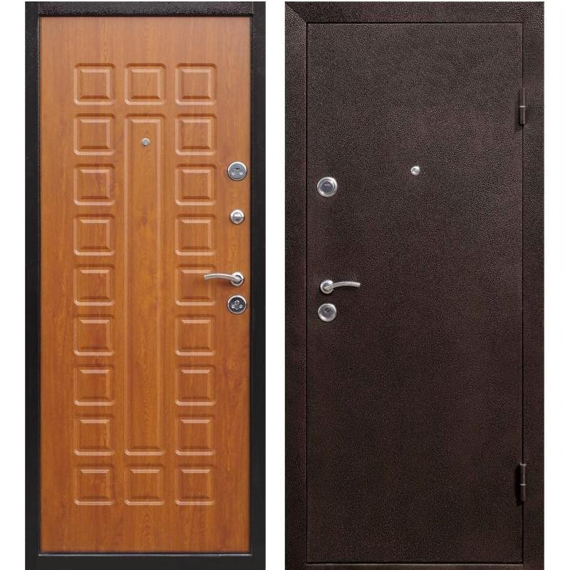 Внешняя сторона двери имеет порошково-полимерное покрытие. Снаружи это надежная глухая металлическая дверь. Внутри же – МДФ-панель с покрытием ПВХ. Простой геометрический орнамент уютной деревянной двери, которая дополняет домашний интерьер, уже пришелся по душе многим покупателям.