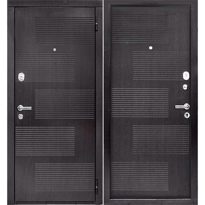 Отделка представлена 8-миллиметровым щитом МДФ, имитирующим текстуру древесины венге. Горизонтальные полосы, выполненные методом фрезеровки, выделяют дверь ЮрСталь. Монреаль из числа других моделей и придают общей композиции завершенность.