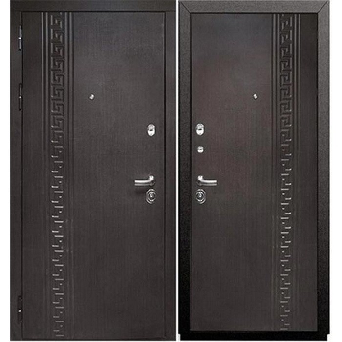 Дверь с двух сторон обшита МДФ 8 мм с покрытием ПВХ в цвете «Венге». Оригинальность двери придает геометрический узор, выполненный с внешней стороны панели. Он не является броским, но в то же время выделяет модель среди сотен аналогичных, успешно вписывается в классический интерьер квартиры или частного дома.