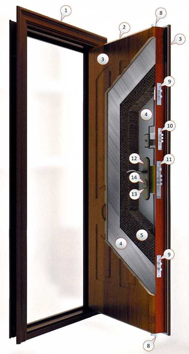 ![]() | 1. Дверная рама (коробка) с несколькими ребрами жесткости, интегрированным наличником и крепежными элементами. 2. Дверное полотно. Имеет многослойную структуру и защитные карманы для замков. 3. Дверное полотно: декоративное покрытие. 4. Дверное полотно: стальной лист. 5. Дверное полотно: наполнитель (в зависимости от модели - пенополиуретан, минеральная вата или сотовый). 6. Уплотнитель. 7. Скрытые регулируемые петли. 8. Вертикальные ригели. 9. Девиаторы. 10. Дополнительный замок. 11. Основной многоканальный замок MASTER-LOCK. 12. Фурнитура. 13. Защитные бронечашечки. 14. Цилиндр MASTER-LOCK. | |