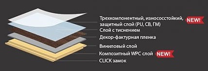 Каждая планка отделочного материала состоит из базовой части, которая обеспечивает плотность и эластичность плитки, и защитного слоя со статичной фактурой и эстетичным покрытием. Защитный слой напольных покрытий Vinilam выполнен из трехкомпонентного, износостойкого слоя который состоит из PU-полиуретана, CB-керамической крошки и UV-ультракомпонента.