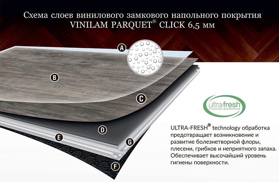 B - Виниловый прозрачный защитный слой – основная защита напольного покрытия от абразивного износа и истирания. Стабилизирован UV лучами. Создает на поверхности 3D декоративный эффект текстуры натурального дерева «Браш». Толщина защитного слоя 0,55 мм.