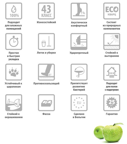 Состав кварц-виниловой плитки Finefloor: многослойный ПВХ, до 70% кварца (песка), стекловолокно.