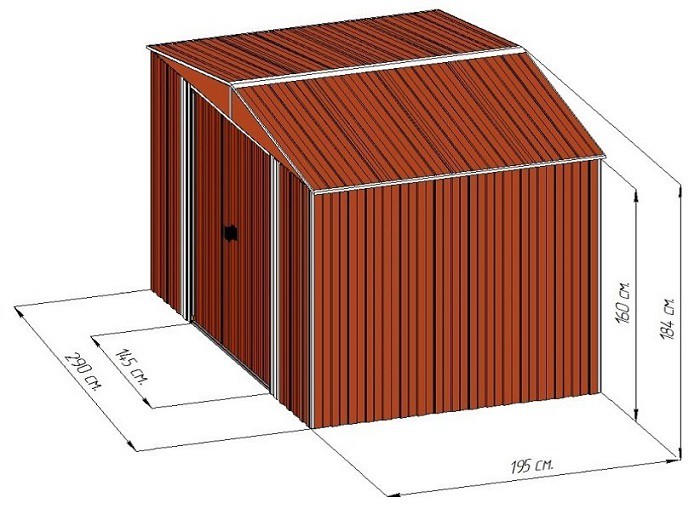 В конструкции сарая используется каркасная технология, что придает сооружению максимальную жесткость. Дополнительную прочность и долговечность обеспечивает толщина металла профлистов в 0,4 мм, которыми обшит каркас сарая.