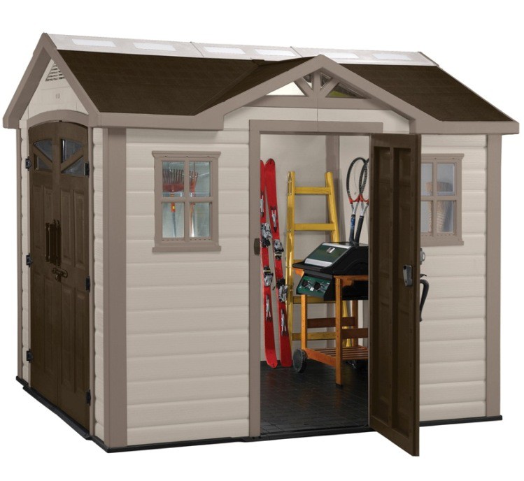 Сарай выполнен из пластика с текстурой под дерево и имеет эстетичный, современный и стильный вид. При этом он очень практичен, так как не требует постоянного ухода, покраски, не меняет цвет, моется обычной водой. Хорошо переносит перепады температуры, температура эксплуатации домика составляет от +80 до -550С. Дополнительную прочность конструкции придает металлический армированный каркас, который выдерживает снеговую нагрузку.