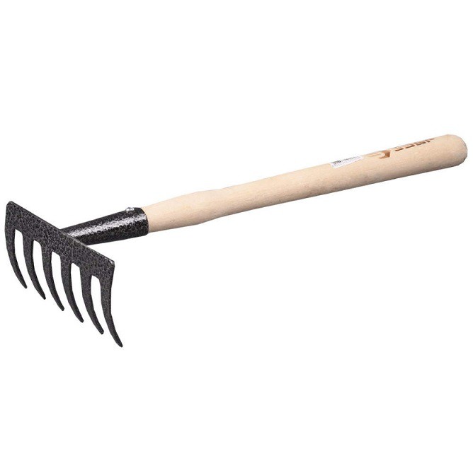 Рабочая часть изготовлена из углеродистой стали и имеет качественную закалку. Ручка инструмента изготовлена из древесины ясеня высшего сорта, прочна и удобна в работе. Имеют 6 прямых зубцов.
