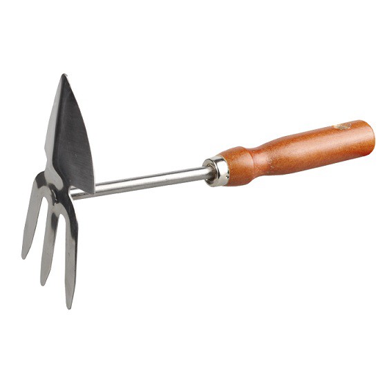 Рабочая часть изготовлена из высококачественной нержавеющей стали. Деревянная рукоятка отполирована, покрыта лаком, имеет отверстие для удобства хранения. Комбинированная мотыжка оснащена тремя зубьями.