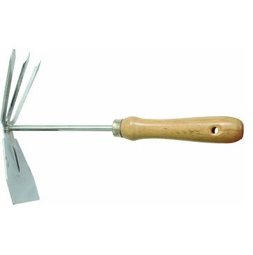 Мотыга FIT с деревянной ручкой 77046 имеет два рабочих профиля. С одной стороны находится тяпка, а с другой вилка. С помощью данного инструмента можно без особых усилий разровнять почву или прополоть грядки. Прочная стальная конструкция рассчитана на длительный срок эксплуатации.