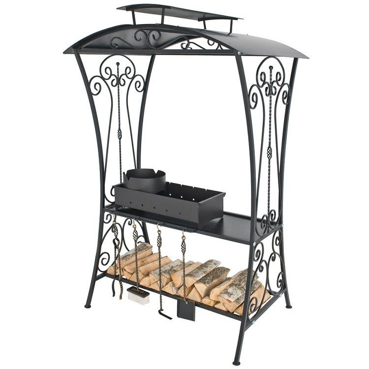 Особенностью мангала является съемная печь под казан, которая позволяет при необходимости увеличить количество шампуров уложенных на мангал. Конструкция также предполагает место для размещения тарелок и оснащена вместительной полкой для дров. А крыша обеспечит укрытие огня и готовящейся на нем пищи от осадков.