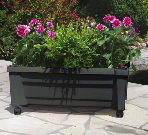 Ящик для растений Калипсо антрацитового цвета от компании KHW отличный способ украшения загородного участка. Модель прямоугольной формы на практичных колесиках, ее удобно передвигать в любую точку сада. Также есть система орошения объемом на 8 литров. Достаточно просто добавить воды и можно не переживать, что цветы засохнут до вашего следующего приезда. Объем клумбы составляет 42 л.