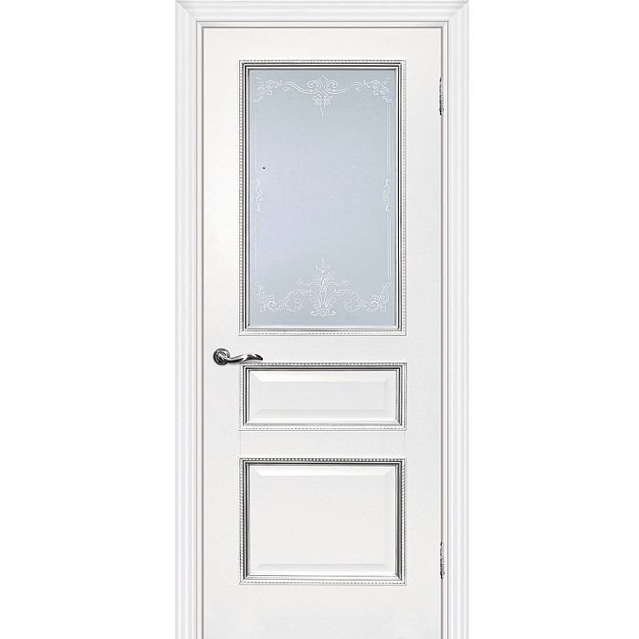 Дверное полотно Мариам Мурано-2 экошпон белое багет с тиснением патина серебро стекло сатинат серебро 2000х800 мм - классические полотна, выполненные в матовом однотонном покрытии, приятном на ощупь. В полотнах Мурано используется декоративный багет, который придает особую роскошь и выразительность изделию.