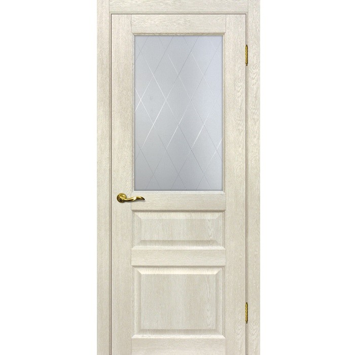 Дверное полотно Мариам Тоскана-2 ПВХ Бьянко стекло белый сатинат 2000х600 мм - современные калевочные межкомнатные двери. В данном виде дверей применяют подетальный принцип сборки, отличить их можно от остальных по наличию декоративных элементов, которые визуально разделяют дверное полотно на несколько частей. Толщина полотна - 38 мм. Полотно остекленное - белый сатинат, контурный полимер бесцветный, рисунок Ромб.