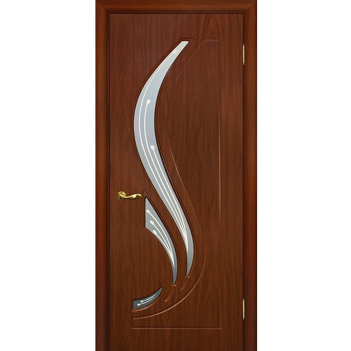 Полотно украшает фигурная вставка из матового стекла, филенка изготовлена из МДФ, каркас состоит из сращенного бруса хвойных пород дерева. Пустоты в полотнах заполняются пористым наполнителем, что способствует повышению прочности конструкции, хорошей звукоизоляции. Данная технология гарантирует устойчивость к перепадам температур - стоевые не ведет. МДФ - материал прочный и экологически безопасный. Финишная отделка - пленка ПВХ немецкого производства.