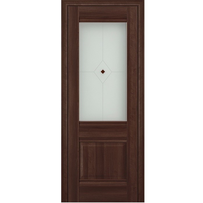 Модель ProfilDoors 2X экошпон Орех Сиена с матовым стеклом Узор 2 с коричневым фьюзингом - серии Х Классика, имеет четкие геометрические формы. Она гармонично впишется в современный интерьер или интерьер в стиле хай-тек и станет прекрасным завершающим элементом дизайна в квартире или офисе. Царговая дверь включает в себя несколько элементов – раму, состоящую из верхней и нижней царги и стоевых, и филенку. В качестве филенки, или, как ее еще называют, наполнителя, используются стекло.