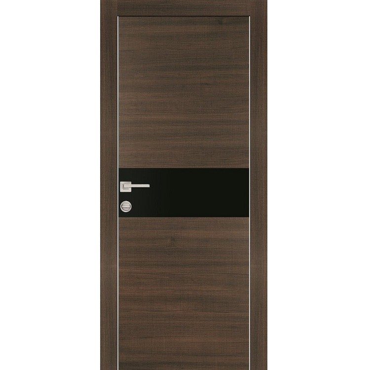 Алюминиевая кромка обрамляет боковые части полотна и защищает их от механических повреждений, а также делает дизайн двери стильным и современным. Дополнительную декоративность полотну придает стекло черный лакобель.