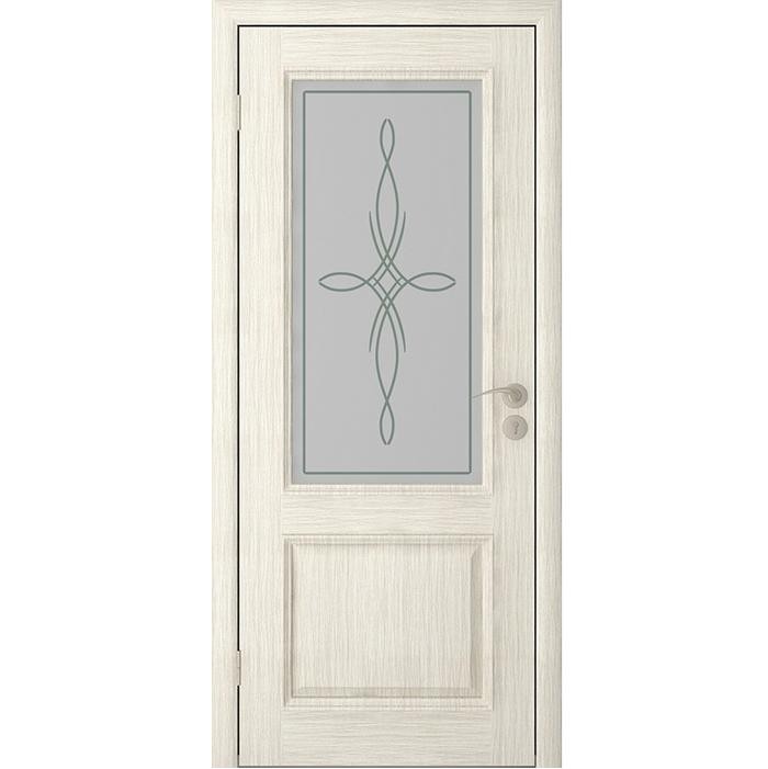 Стекло – мателюкс белого цвета с художественной фрезеровкой. Стекло имеет матовое покрытие с лицевой стороны двери и глянцевое с оборотной.
