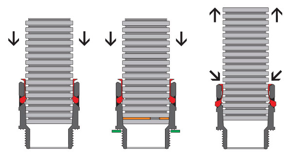| Стыковка труб с аксессуарами Обеспечивается простым защёлкиванием. Достигается степень защиты IP66 без применения уплотнителей | Герметичная стыковка труб с аксессуарами Обеспечивается простым защёлкиванием. Применение уплотнительных колец PAR и уплотнительных прокладок PAPM обеспечивает степень защиты IP68 | Извлечение трубы из аксессуара Достаточно нажать на замок фиксатора |
