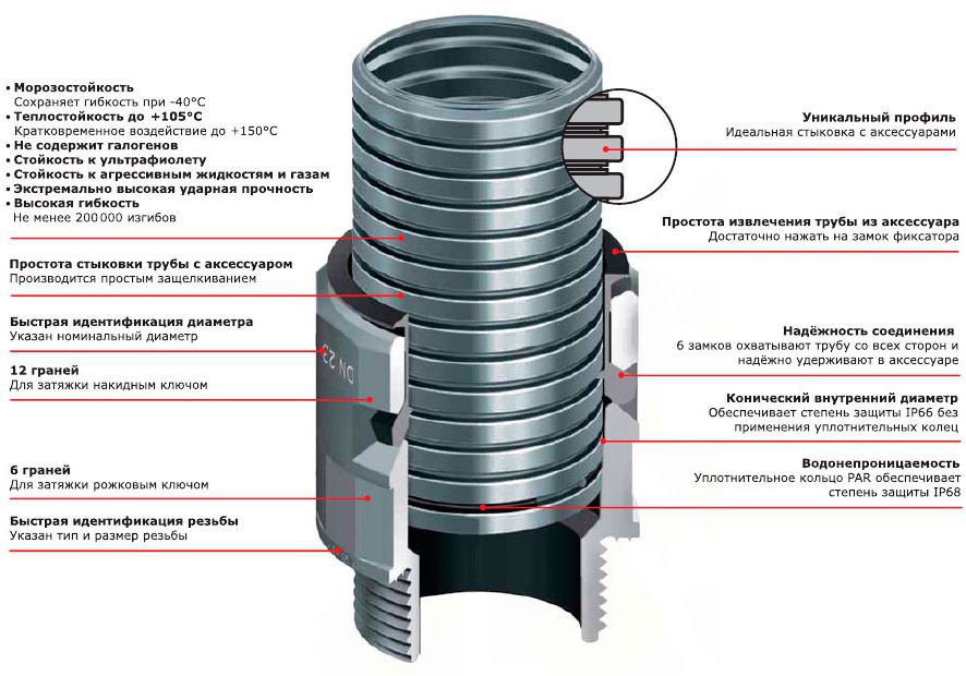 Трубы сохраняют высокую гибкость и ударную прочность даже при экстремально низких температурах (до -40°С), способны работать при экстремально высоких температурах (до +105°С) и выдерживают кратковременное тепловое воздействие до +150°С. Уникальные аксессуары обеспечивают простой монтаж и надёжную герметизацию. Сверхгибкие, износостойкие, стойкие к ударным и вибрационным нагрузкам, стойкие к ультрафиолету, стойкие к агрессивному воздействию масел, растворителей и различных видов топлива трубы являются прекрасной защитой кабеля при жёстких условиях эксплуатации на промышленных предприятиях.