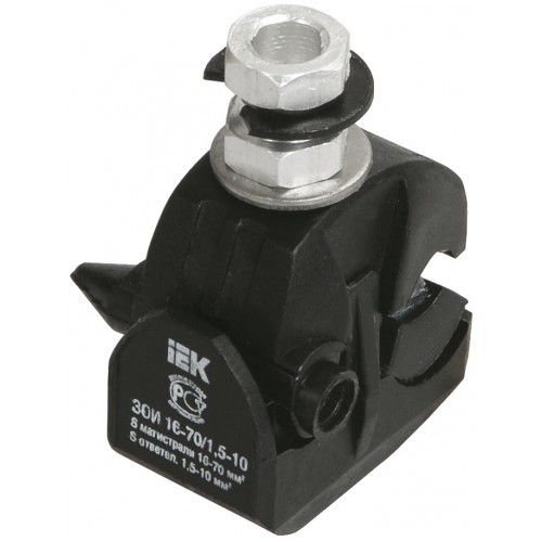 Зажимы IEK ЗОИ 16-70 предназначены для соединения и ответвления фазных и нулевых самонесущих изолированных проводов напряжением до 1 кВ, а также для ответвления абонентских проводников (проводов освещения). При затягивании болтов ножи контактной пластины образуют надежный электрический контакт, прокалывая изоляцию магистрального проводника и проводника ответвления. Конструкция зажима обеспечивает герметичность соединения и надежный электрический контакт, что подтверждено испытаниями, во время которых зажим погружался на глубину 1 метр на 1 минуту при подаче переменного напряжения 6 кВ частотой 50 Гц.