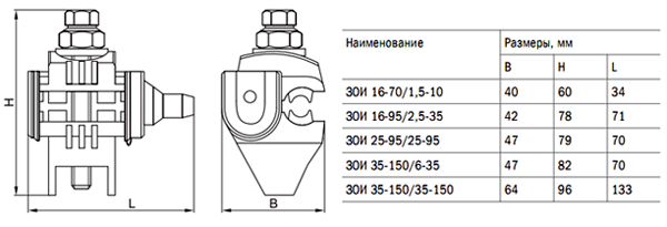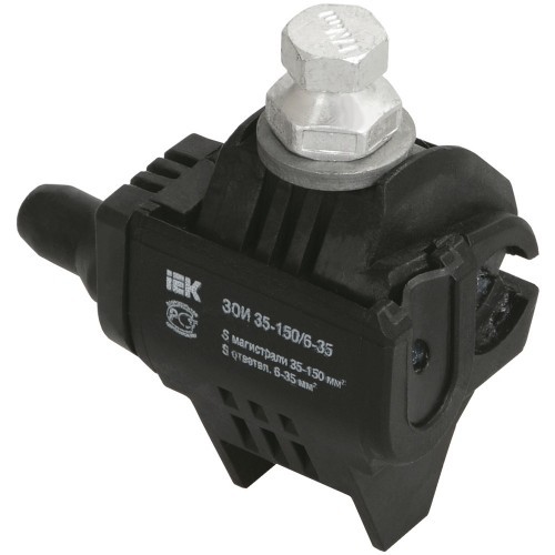 Зажимы IEK ЗОИ 35-150/6-35 предназначены для соединения и ответвления фазных и нулевых самонесущих изолированных проводов напряжением до 1 кВ, а также для ответвления абонентских проводников (проводов освещения). При затягивании болтов ножи контактной пластины образуют надежный электрический контакт, прокалывая изоляцию магистрального проводника и проводника ответвления. Конструкция зажима обеспечивает герметичность соединения и надежный электрический контакт, что подтверждено испытаниями, во время которых зажим погружался на глубину 1 метр на 1 минуту при подаче переменного напряжения 6 кВ частотой 50 Гц.