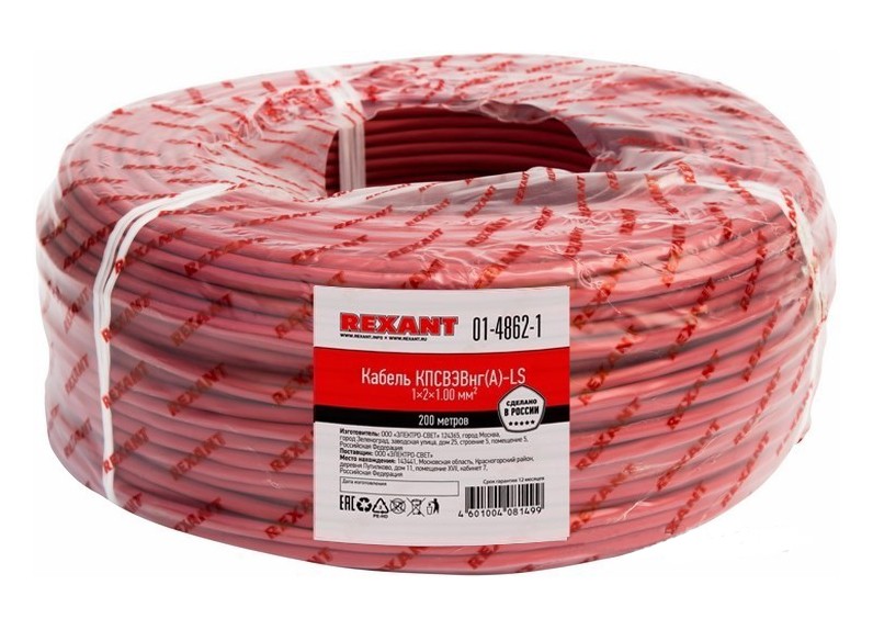Жилы – однопроволочные из медной проволоки. Общий экран из алюмолавсановой ленты с контактным проводником из медной луженой проволоки. На жилах – ПВХ-изоляция из пластиката в виде сплошного концентрического слоя. Изолированные жилы скручены в пару. На витые пары наложена оболочка из ПВХ красного цвета, которые не поддерживает горение.