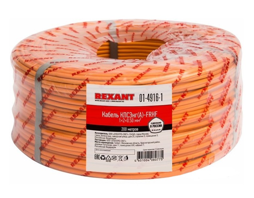 Кабели Rexant КПСЭнг(А)-FRHF 1x2x0,5 мм симметричной парной скрутки, огнестойкие, без галогенный, не распространяющие горение при групповой прокладке и не выделяющие коррозионно-активных газообразных продуктов при горении и тлении.