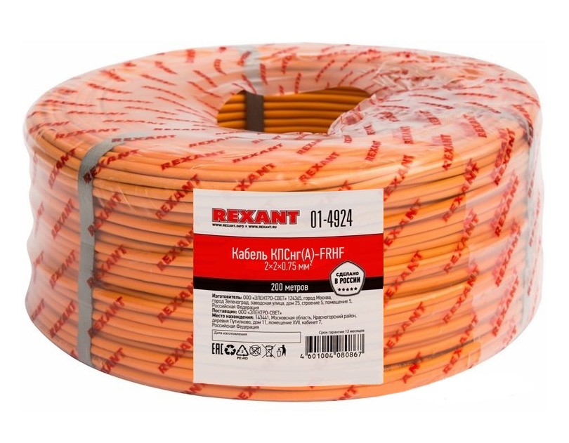 Кабели Rexant КПСнг(А)-FRHF 2x2x0,75 мм симметричной парной скрутки, огнестойкие, без галогенный, не распространяющие горение при групповой прокладке и не выделяющие коррозионно-активных газообразных продуктов при горении и тлении.