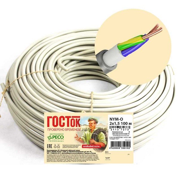 Кабель ГОСТок NYM-O имеет дополнительное внутреннее заполнение, которое повышает его устойчивость к внешним механическим воздействиями. Токопроводящие жилы кабеля выполнены из меди и имеют круглую форму сечения.