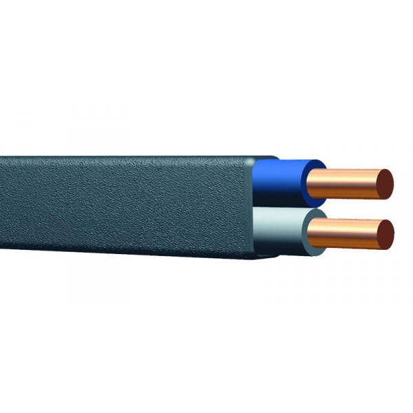 Плоский кабель ВВГнг 2х1,5 м с двумя медными жилами сечением 1,5 мм2. Оболочка выполнена из поливинилхлоридного пластиката, который не распространяет горение. Следует знать, что синий или голубой цвет означает, что жила является нулевой, а серая жила означает заземление.