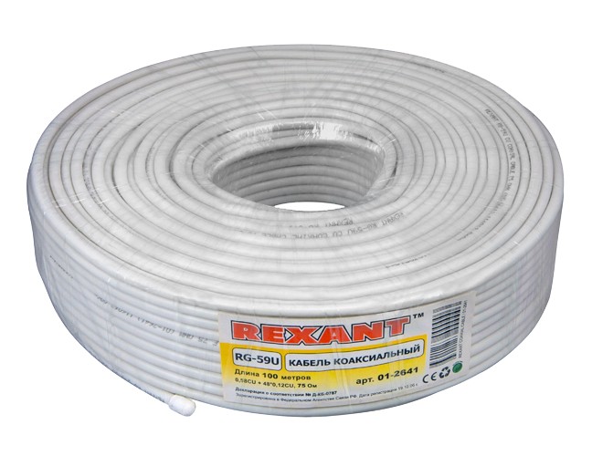 Для передачи сигналов в составе распределительных телесетей используют коаксиальный кабель Rexant RG 59U, который прокладывается внутри помещений – жилых домов и предприятий. Он незаменим для телевизионных и видеосистем. Кабель RG-59U состоит из двух проводников -внутреннего и внешнего, расположенных соосно и разделенных полиэтиленовым диэлектриком. Центральный одножильный проводник изготовлен из качественной меди, его диаметр равен 0,58 мм. Он обеспечивает отличную передачу сигнала к телевизионному аппарату. Экран кабеля, наложенный на сердечник, состоит из медной оплетки и защищает передаваемый сигнал от помех. Внешняя оболочка данного кабеля выполнена из ПВХ и имеет белый цвет. Номинальное волновое сопротивление кабеля – 75 Ом. Диаметр кабеля d=6 мм.