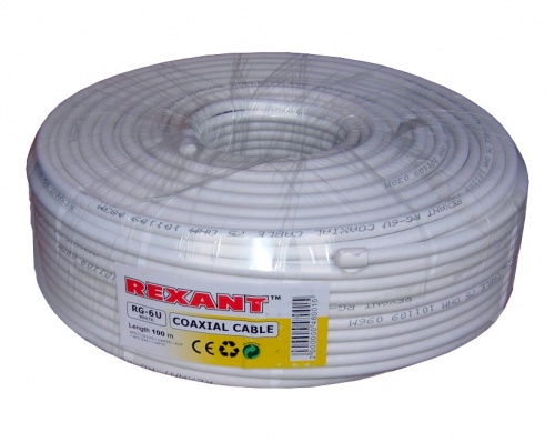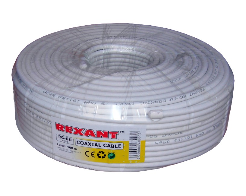 Кабель коаксиальный Rexant RG-6U (75 Ом) считается самым распространенным решением для подключения телевизионных систем. Обеспечивая передачу аналоговых сигналов, этот кабель применяется для прокладки внутри помещений в составе распределительных ТВ-сетей. Коаксиальный кабель RG-6U (75 Ом) по структуре представляет собой два проводника – внутренний и внешний, расположенных соосно и разделенных изолирующим диэлектриком. Центральный проводник – однопроводная омедненная жила - окружен изоляцией из вспененного полиэтилена. Экран, наложенный на сердечник, имеет дополнительную алюминиевую оплетку из 48 нитей для обеспечения его электрической непрерывности. Сплошная внешняя оболочка изготовлена из ПВХ и имеет белый цвет. Номинальное волновое сопротивление данного кабеля составляет 75 Ом.