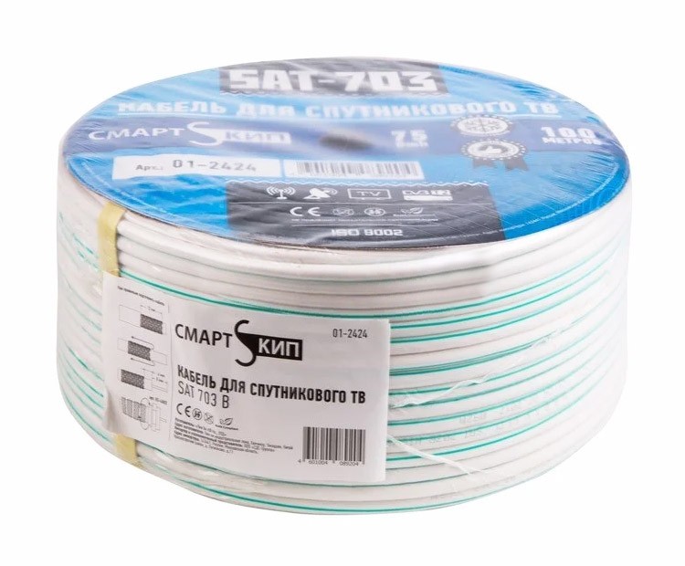 Кабель СмартКИП SAT 703 B является наиболее качественным и эффективным решением для установки и подключения спутниковой телевизионной системы. Он отлично передает высокочастотные видео- и аудиосигналы и прокладывается внутри помещений. Этот коаксиальный кабель состоит из центрального проводника и двойного экрана, размещенных соосно. Внутренний одножильный проводник изготовлен из высококлассной меди и помещен в полиэтиленовый диэлектрик, способствующий сохранению соосного расположения проводников. Диаметр проводника 0,9 мм. Алюминиевый экран, наложенный на сердечник, имеет дополнительную медную оплетку и благодаря этому надежно защищает передаваемый сигнал от внешних помех. Номинальное волновое сопротивление кабеля – 75 Ом. Внешняя оболочка изготовлена из ПВХ и имеет белый цвет.
