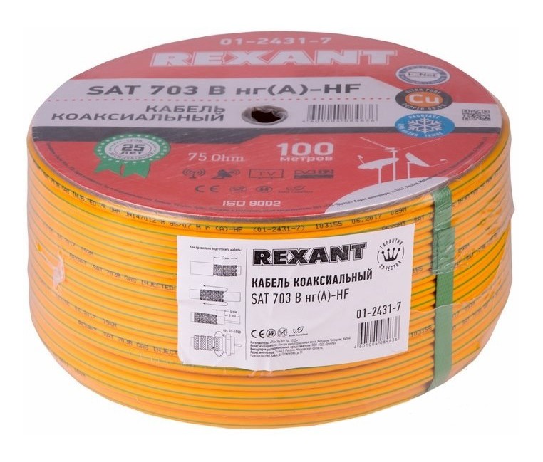Кабель Rexant SAT 703 B нг(А)-HF коаксиальный радиочастотный со вспененной полиэтиленовой изоляцией в оболочке из безгалогеннойполимерной композиции HF, огнестойкой, не распространяющие горение при групповой прокладке, пониженной пожарной опасности с низкой коррозионной активностью продуктов горения и тления.