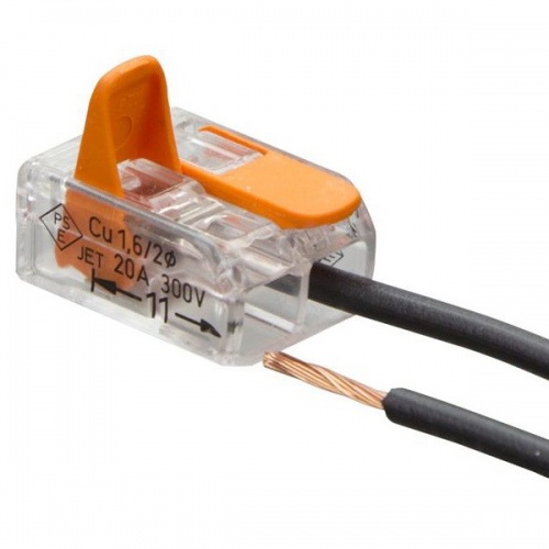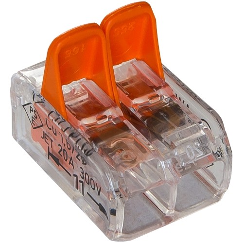 Миниатюрный соединительный клеммник на два провода с нажимными рычагами и прозрачным корпусом. Для подключения тонких проводов от 0,25мм.кв.